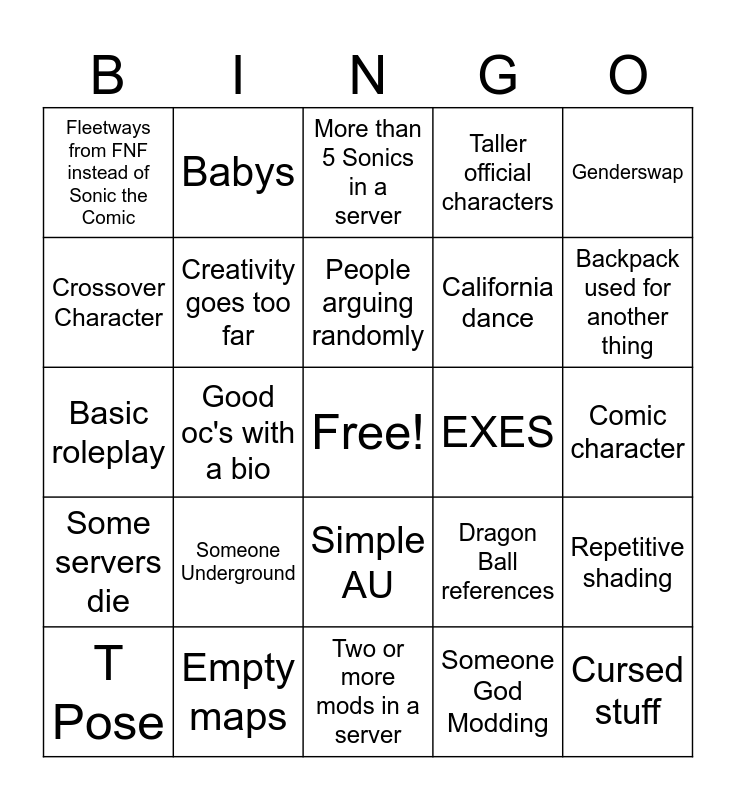 This bingo card has a free space and 24 words: Someone Underground, Empty maps, People arguing randomly, T Pose, Genderswap, Fleetways from FNF instead of Sonic the Comic, Crossover Character, Babys, EXES, Simple AU, California dance, Basic roleplay, Dragon Ball references, Repetitive shading, Creativity goes too far, Someone God Modding, Comic character, More than 5 Sonics in a server, Backpack used for another thing, Good oc's with a bio, Cursed stuff, Some servers die, Taller official characters and Two or more mods in a server.
