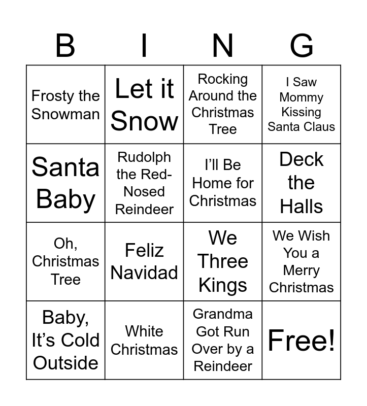 This bingo card has 23 words: Free!, Jingle Bell Rock, Deck the Halls, All I Want for Christmas is You, Santa Baby, Frosty the Snowman, Rudolph the Red-Nosed Reindeer, Let it Snow, Baby, It’s Cold Outside, Last Christmas, Feliz Navidad, Oh, Christmas Tree, Blue Christmas, Walking in a Winter Wonderland, White Christmas, Have Yourself a Merry Little Christmas, Rocking Around the Christmas Tree, We Three Kings, I’ll Be Home for Christmas, We Wish You a Merry Christmas, I Saw Mommy Kissing Santa Claus, Grandma Got Run Over by a Reindeer and Santa Clause is Coming to Town.