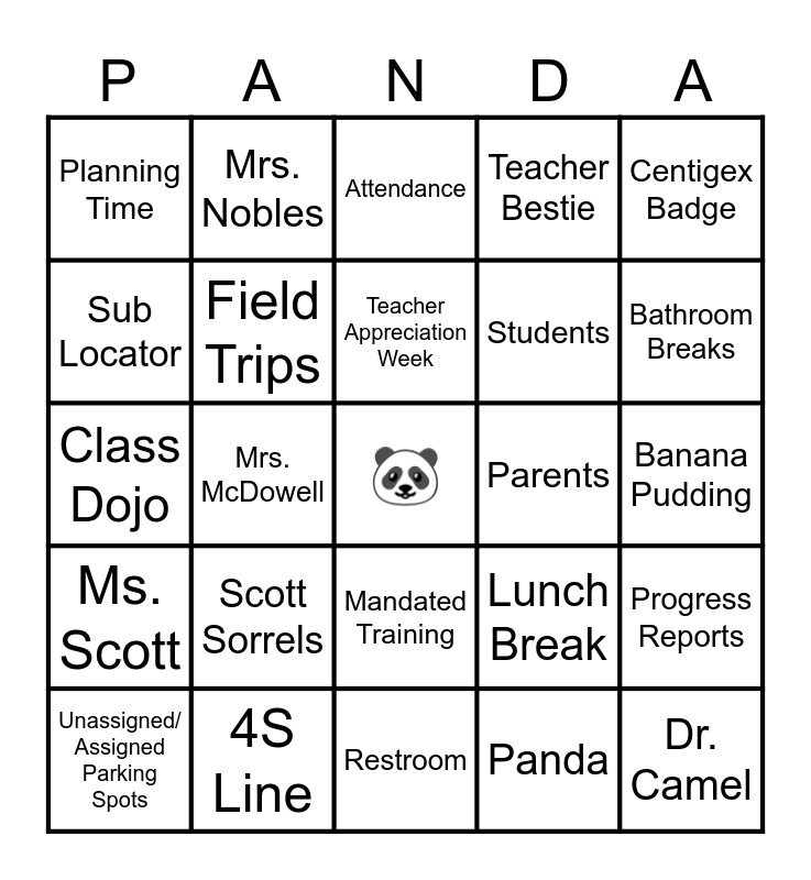 This bingo card has a free space and 30 words: 4S Line, Hopes and Prayers, Mrs. McDowell, Paycheck, Planning Time, Attendance, Field Trips, Mandated Training, Parents, Restroom, Banana Pudding, Dr. Camel, Panda, Retroactive Pay, Bathroom Breaks, Copier, Lunch Break, Ms. Scott, Scott Sorrels, Centigex Badge, Class Dojo, Learning Gains, Mrs. Nobles, Students, Sub Locator, Teacher Bestie, Progress Reports, Unassigned/ Assigned Parking Spots, Teacher Appreciation Week and PLC.