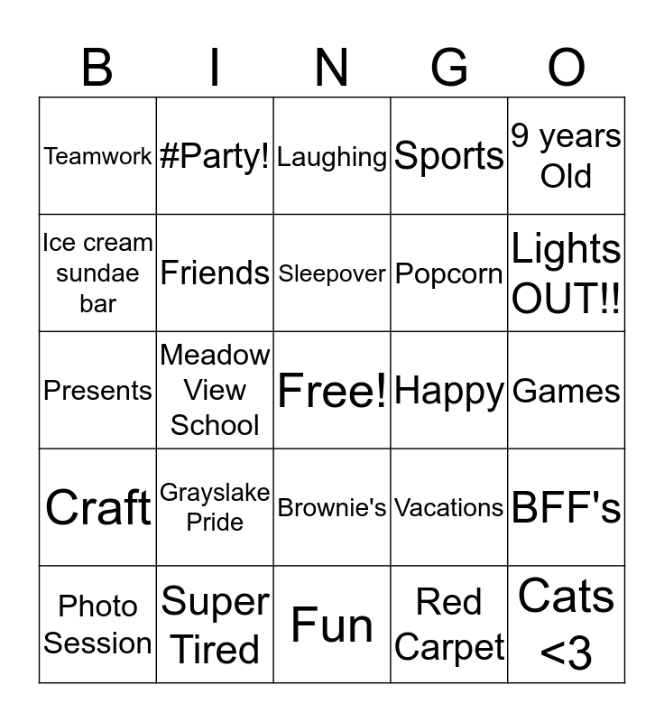 This bingo card has a free space and 24 words: Grayslake Pride, Super Tired, Sleepover, Photo Session, 9 years Old, Teamwork, Ice cream sundae bar, #Party!, Happy, Brownie's, Popcorn, Presents, Vacations, BFF's, Friends, Red Carpet, Games, Laughing, Lights OUT!!, Meadow View School, Cats <3, Craft, Sports and Fun.