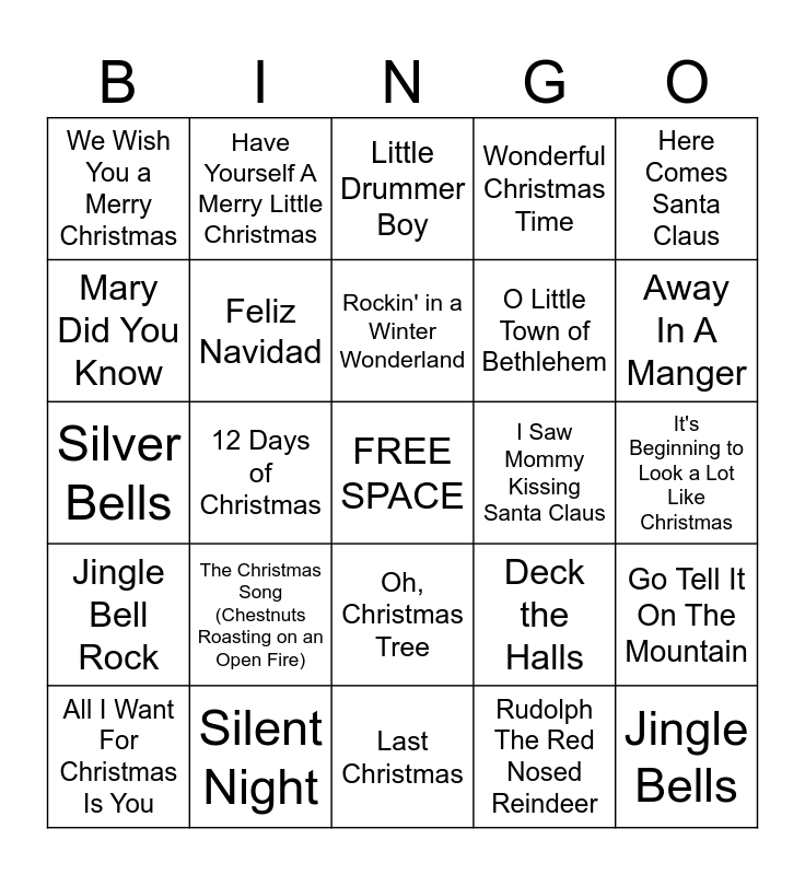 This bingo card has a free space and 34 words: White Christmas, Rudolph The Red Nosed Reindeer, Santa Claus Is Coming To Town, Rockin' Around The Christmas Tree, Jingle Bell Rock, Feliz Navidad, Here Comes Santa Claus, All I Want For Christmas Is You, Have Yourself A Merry Little Christmas, Frosty The Snowman, Rockin' in a Winter Wonderland, Little Drummer Boy, You're A Mean One Mr. Grinch, All I Want For Christmas Is My Two Front Teeth, I Saw Mommy Kissing Santa Claus, Away In A Manger, Silent Night, Silver Bells, The Christmas Song (Chestnuts Roasting on an Open Fire), Deck the Halls, Oh, Christmas Tree, Let It Snow, We Wish You a Merry Christmas, It's Beginning to Look a Lot Like Christmas, Last Christmas, Jingle Bells, Wonderful Christmas Time, O Holy Night, O Little Town of Bethlehem, Mary Did You Know, The First Noel, 12 Days of Christmas, Go Tell It On The Mountain and Do You Hear What I Hear.