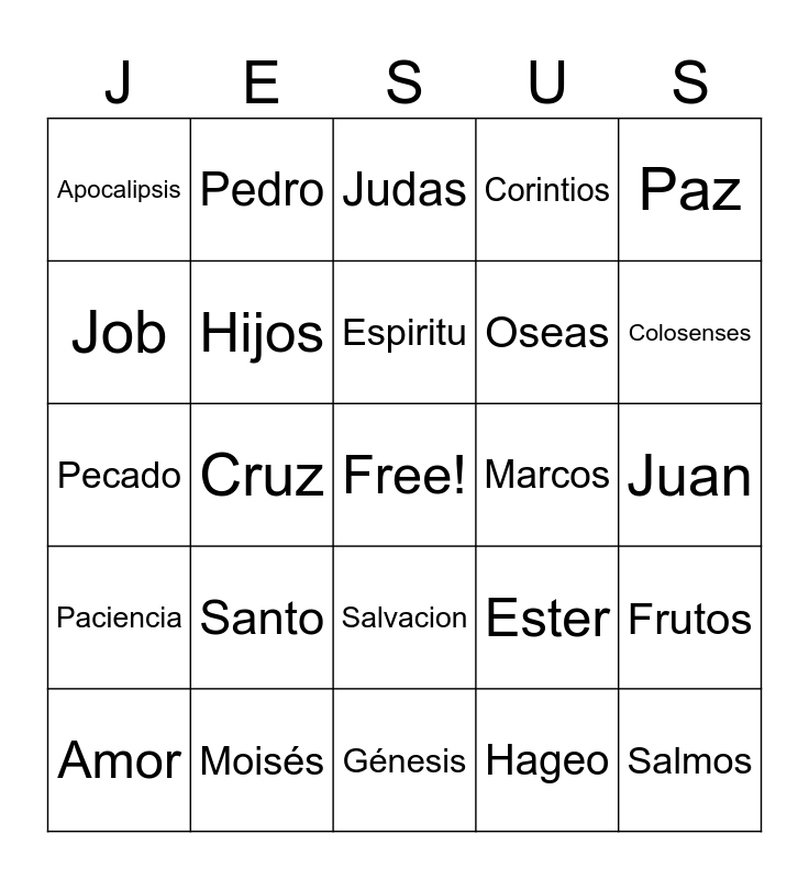 This bingo card has a free space and 39 words: Iglesia, Jesus, Pueblo, Hijos, Amor, Salvacion, Espiritu, Santo, Paz, Paciencia, Cruz, Corintios, Salmos, Juan, Marcos, Santo, Proverbios, Apocalipsis, Jeremías, Ester, Job, Génesis, Oseas, Colosenses, Gálatas, Tito, Hebreos, Santiago, Pablo, Pedro, 1 Pedro, 2 Pedro, Judas, Moisés, Hageo, Esdras, Frutos, Pecado and Israel.