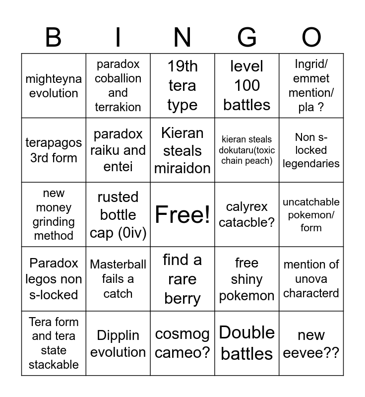 This bingo card has a free space and 24 words: Masterball fails a catch, Dipplin evolution, Kieran steals miraidon, Tera form and tera state stackable, Ingrid/ emmet mention/ pla ?, mighteyna evolution, terapagos 3rd form, paradox coballion and terrakion, calyrex catacble?, find a rare berry, kieran steals dokutaru(toxic chain peach), new money grinding method, free shiny pokemon, mention of unova characterd, paradox raiku and entei, Double battles, uncatchable pokemon/ form, 19th tera type, Non s-locked legendaries, rusted bottle cap (0iv), new eevee??, Paradox legos non s-locked, level 100 battles and cosmog cameo?.