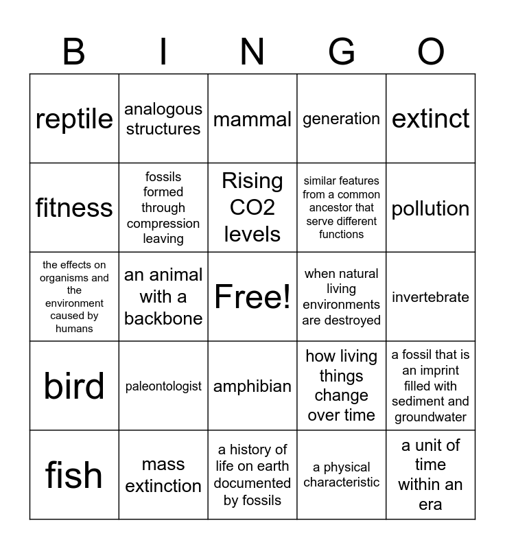 This bingo card has a free space and 31 words: a history of life on earth documented by fossils, a type of living thing, an animal with a backbone, a unit of time that tells what kind of life existed, reptile, mammal, fossils formed through compression leaving, how living things change over time, when natural living environments are destroyed, a physical characteristic, invertebrate, a unit of time within an era, invasive species, overharvesting, pollution, fossils that show the actions of ancient animals, a fossil that is an imprint filled with sediment and groundwater, paleontologist, bird, amphibian, extinct, ancient organisms that living things descended from, fish, analogous structures, similar features from a common ancestor that serve different functions, fitness, generation, the effects on organisms and the environment caused by humans, mass extinction, Rising CO2 levels and petrified fossil remains.