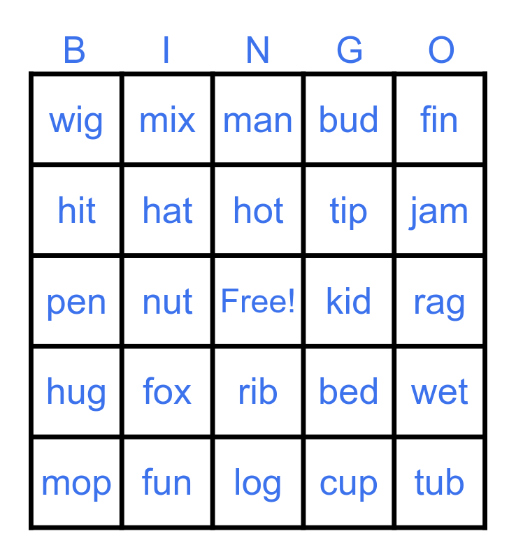 This bingo card has a free space and 25 words: fox, log, hot, mop, fin, wig, hit, mix, kid, rib, tip, pen, bed, wet, hat, map, rag, man, jam, nut, tub, fun, hug, bud and cup.