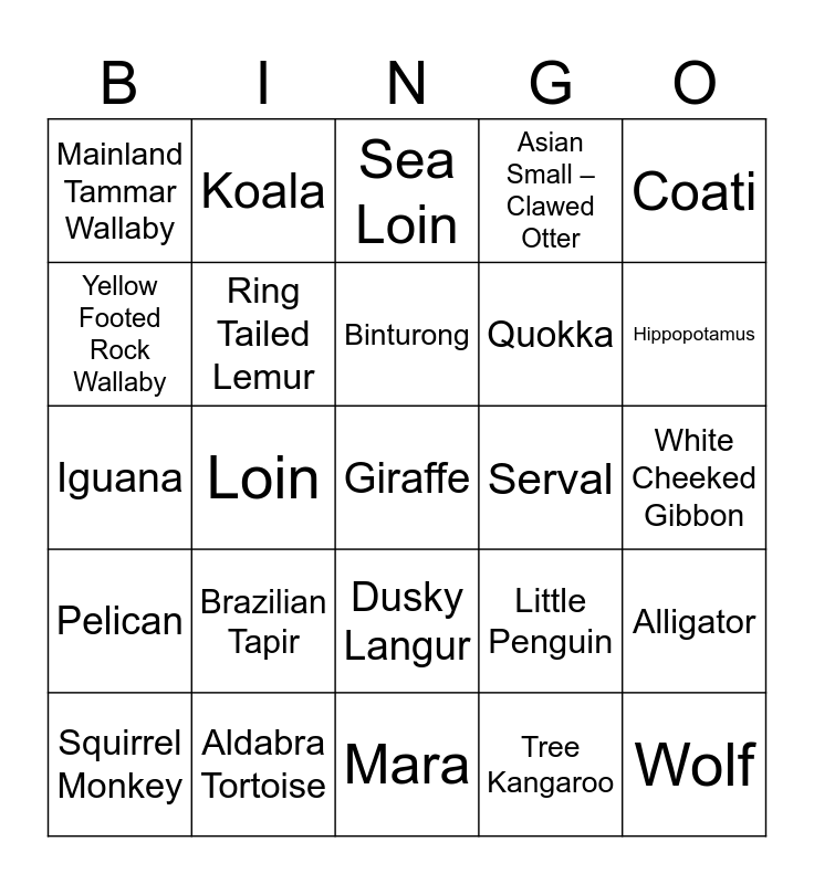 This bingo card has 49 words: Free!, Giraffe, Meerkat, Mara, Brazilian Tapir, Southern-Nosed Wombat, Koala, Kangaroo, Yellow Footed Rock Wallaby, Dingo, Ring Tailed Lemur, Asian Small – Clawed Otter, Alligator, Little Penguin, Komodo dragon, Black and White Colobus, Binturong, Serval, Fox, Coati, Loin, Tree Kangaroo, Mainland Tammar Wallaby, Quokka, Tiger, Hippopotamus, Squirrel Monkey, Malayan Tapir, Dusky Langur, Pelican, Macaws, Palm Cockatoo, Red Panda, Giant Panda, Aldabra Tortoise, African Tortoise, Echidna, Cassowary, White Cheeked Gibbon, Siamang, Orangutan, Mandrill, Wolf, Baboon, Iguana, Sea Loin, Farmyard, Reptile House and Nocturnal House.