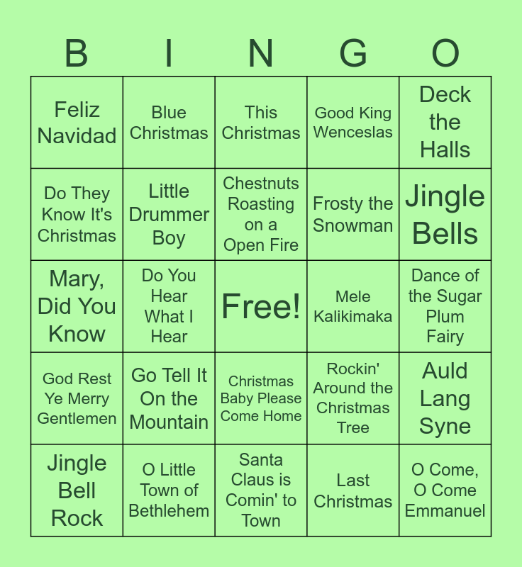 This bingo card has a free space and 63 words: All I Want for Christmas is You, Angels From the Realms of Glory, Angels We Have Heard on High, Auld Lang Syne, Away in a Manger, Baby, It's Cold Outside, Blue Christmas, Carol of the Bells, Chestnuts Roasting on a Open Fire, The Chipmunk Song, Christmas Baby Please Come Home, Christmas Time is Here, Dance of the Sugar Plum Fairy, Deck the Halls, Ding Dong Merrily on High, Do They Know It's Christmas, Do You Hear What I Hear, Feliz Navidad, The First Noel, Frosty the Snowman, Go Tell It On the Mountain, God Rest Ye Merry Gentlemen, Good King Wenceslas, Grandma Got Run Over By a Reindeer, Hark! The Herald Angels Sing, A Holly Jolly Christmas, I Heard the Bells on Christmas Day, I Saw Mommy Kissing Santa Claus, I Saw Three Ships, In the Bleak Midwinter, Infant Holy, Infant Lowly, It Came Upon the Midnight Clear, It's Beginning to Look a Lot Like Christmas, It's the Most Wonderful Time of the Year, Jingle Bells, Jingle Bell Rock, Joy to the World, Last Christmas, Let It Snow, Let It Snow, Let It Snow, Little Drummer Boy, Mary, Did You Know, Mele Kalikimaka, O Christmas Tree, O Come All Ye Faithful, O Come, O Come Emmanuel, O Little Town of Bethlehem, O Holy Night, Rockin' Around the Christmas Tree, Rudolph the Red-Nosed Reindeer, Run Run Rudolph, Santa Baby, Santa Claus is Comin' to Town, Silent Night, Sing We Now of Christmas, Sleigh Ride, This Christmas, Up on the Housetop, We Three Kings, We Wish You a Merry Christmas, What Child is This, White Christmas, Winter Wonderland and You’re a Mean One Mr. Grinch.