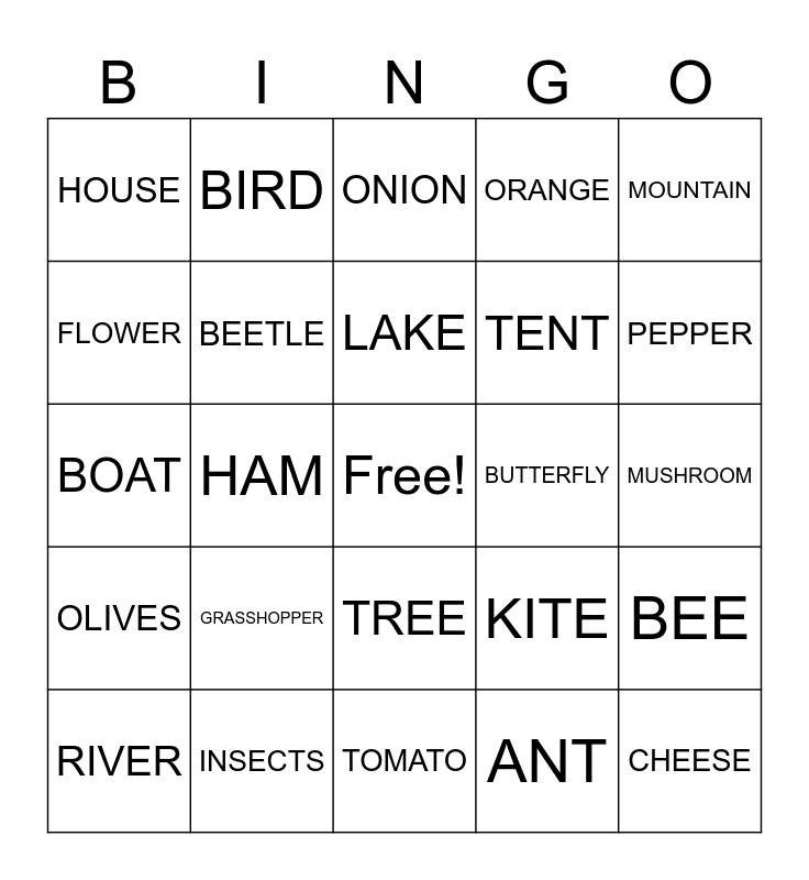 This bingo card has a free space and 24 words: GRASSHOPPER, INSECTS, LAKE, RIVER, MOUNTAIN, HOUSE, FLOWER, BIRD, BUTTERFLY, TREE, TENT, BOAT, KITE, BEE, BEETLE, ANT, MUSHROOM, ONION, PEPPER, HAM, CHEESE, OLIVES, ORANGE and TOMATO.