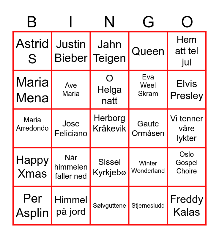 This bingo card has 25 words: Når himmelen faller ned, Sølvguttene, O Helga natt, Per Asplin, Hem att tel jul, Astrid S, Maria Mena, Justin Bieber, Gaute Ormåsen, Sissel Kyrkjebø, Eva Weel Skram, Maria Arredondo, Winter Wonderland, Oslo Gospel Choire, Ave Maria, Freddy Kalas, Vi tenner våre lykter, Jahn Teigen, Elvis Presley, Jose Feliciano, Herborg Kråkevik, Himmel på jord, Happy Xmas, Queen and Stjernesludd.