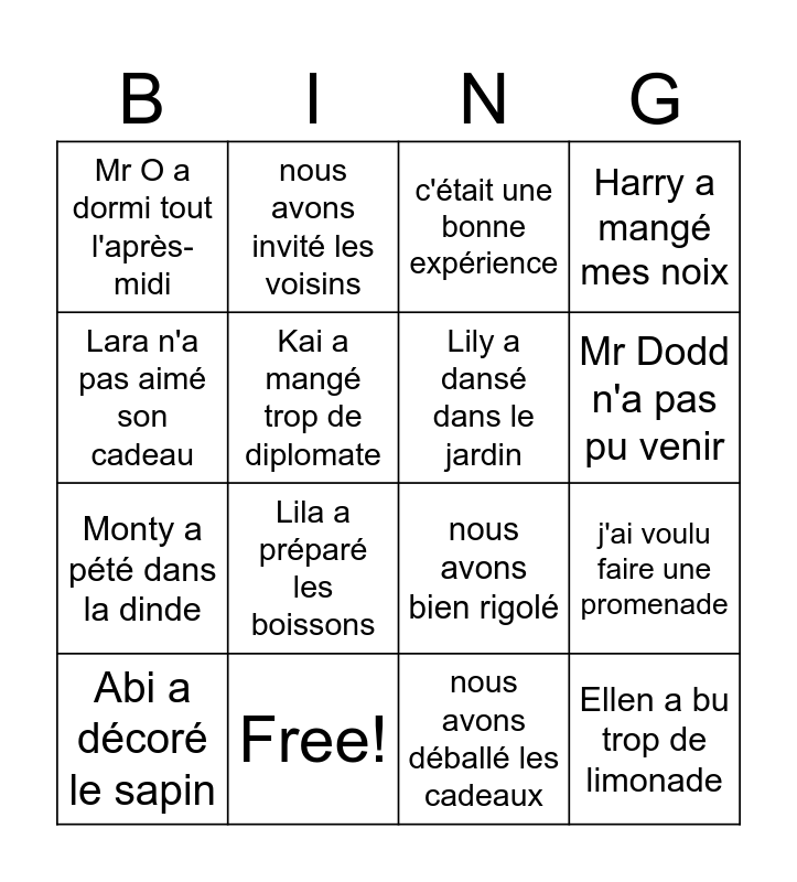 This bingo card has 22 words: Free!, nous avons bien mangé, nous avons invité les voisins, nous nous sommes amusés, Kai a mangé trop de diplomate, Lily a dansé dans le jardin, Mr O a dormi tout l'après-midi, c'était une bonne expérience, nous avons bien rigolé, Ellen a bu trop de limonade, Monty a pété dans la dinde, Harry a mangé mes noix, j'ai apprécié le gâteau, James J a firté avec ma grand mère, nous avons déballé les cadeaux, nous avons trop mangé, j'ai voulu faire une promenade, Abi a décoré le sapin, Lila a préparé les boissons, Lara n'a pas aimé son cadeau, Mr Dodd n'a pas pu venir and J'aurais dû inviter mon oncle.