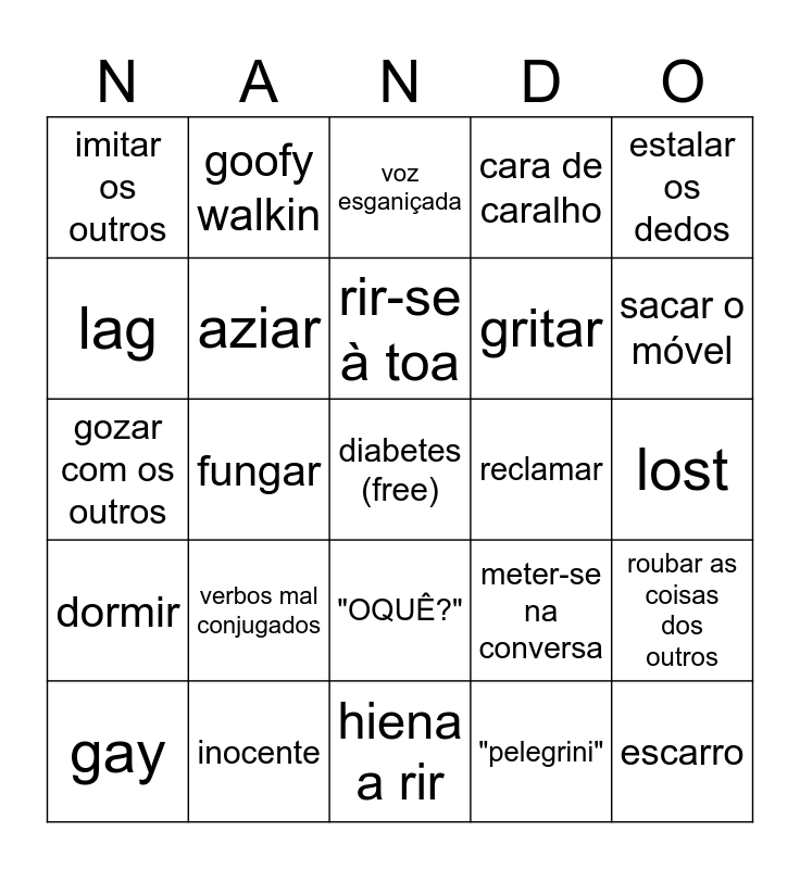 This bingo card has a free space and 49 words: quem é este gajo?, escarro, pedir comida, hiena a rir, verbos mal conjugados, brasileiro, goofy walkin, ir ao bar, lag, "legit", aziar, cara de caralho, roubar as coisas dos outros, meter-se na conversa, falar para dentro, cantar, rir-se à toa, reclamar, delay, estalar os dedos, fungar, "pelegrini", imitar os outros, gritar, falar com a Maria, sacar o móvel, gay, exagerar, "OQUÊ?", dormir, anime, rage, fonte: confia, bater nos outros, inocente, sus, desumilde, racismo, lost, surdo, homofobia, xenofobia, sem noção, achar-se superior, gozar com os outros, voz esganiçada, individualista, referências and pernas cruzadas.