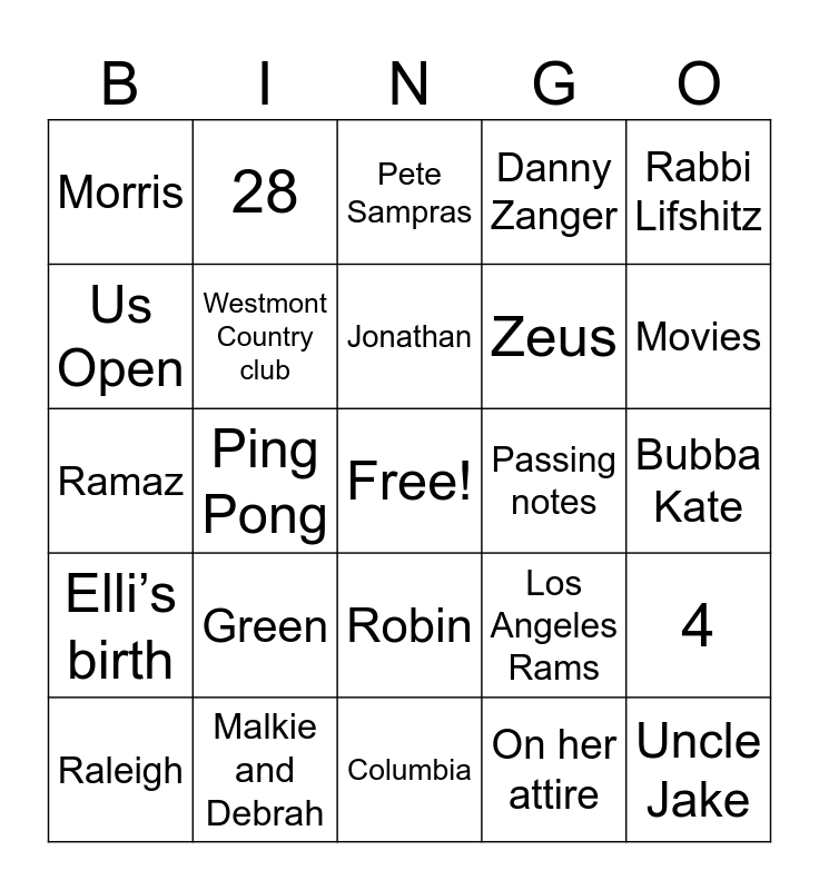This bingo card has a free space and 24 words: Green, Malkie and Debrah, Jonathan, Raleigh, Rabbi Lifshitz, Morris, Us Open, 28, Passing notes, Robin, Zeus, Ramaz, Los Angeles Rams, 4, Westmont Country club, On her attire, Bubba Kate, Pete Sampras, Movies, Ping Pong, Uncle Jake, Elli’s birth, Danny Zanger and Columbia.