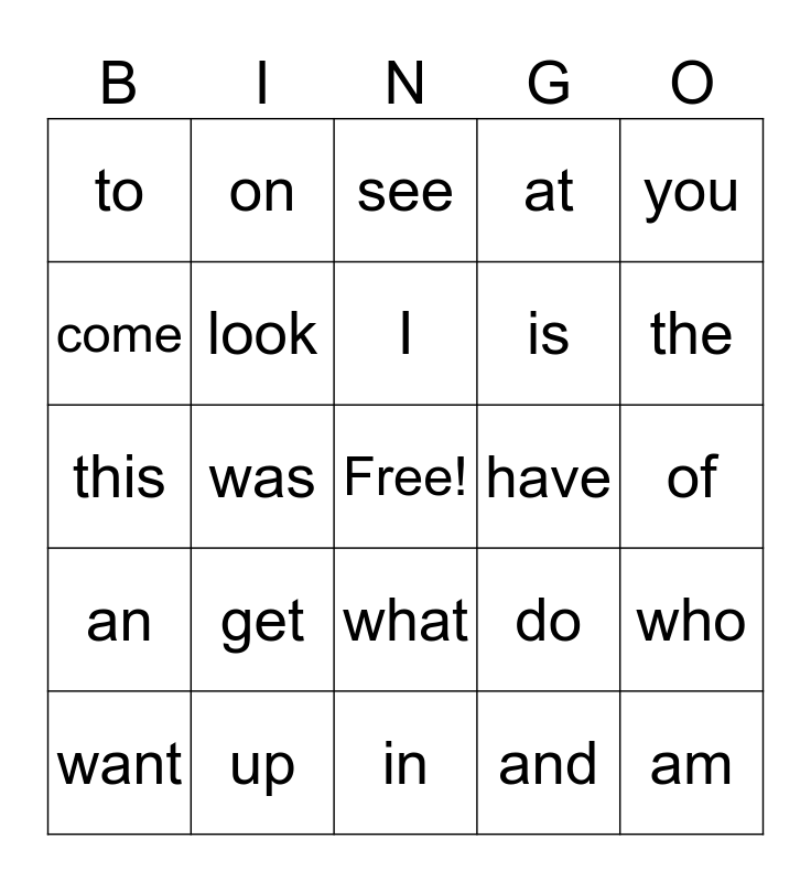 This bingo card has a free space and 24 words: get, up, I, want, you, to, come, on, have, what, is, this, do, who, look, and, of, see, the, was, am, an, at and in.