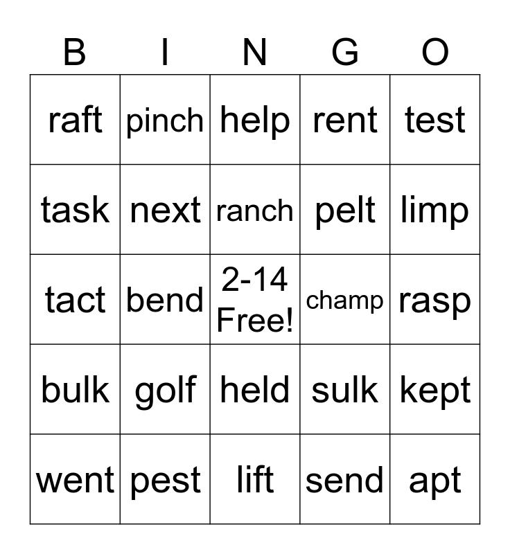 This bingo card has a free space and 24 words: golf, pest, ranch, went, test, raft, task, pinch, champ, held, pelt, tact, sulk, kept, next, send, rasp, help, limp, bend, apt, bulk, rent and lift.