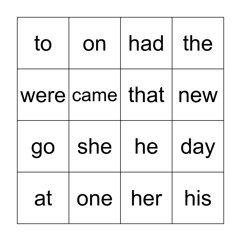 This bingo card has 16 words: one, day, had, to, go, on, he, her, were, came, at, the, she, new, that and his.