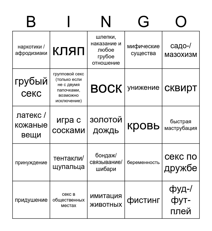 This bingo card has a free space and 24 words: ΡΠ΅Π½ΡΠ°ΠΊΠ»ΠΈ/ ΡΡΠΏΠ°Π»ΡΡΠ°, ΡΠ΅ΠΊΡ Π² ΠΎΠ±ΡΠ΅ΡΡΠ²Π΅Π½Π½ΡΡ ΠΌΠ΅ΡΡΠ°Ρ , Π²ΠΎΡΠΊ, ΠΏΡΠΈΠ΄ΡΡΠ΅Π½ΠΈΠ΅, ΡΠ°Π΄ΠΎ-/ΠΌΠ°Π·ΠΎΡ ΠΈΠ·ΠΌ, Π½Π°ΡΠΊΠΎΡΠΈΠΊΠΈ / Π°ΡΡΠΎΠ΄ΠΈΠ·ΠΈΠ°ΠΊΠΈ, Π³ΡΡΠ±ΡΠΉ ΡΠ΅ΠΊΡ, ΠΊΠ»ΡΠΏ, ΠΊΡΠΎΠ²Ρ, Π±ΠΎΠ½Π΄Π°ΠΆ/ ΡΠ²ΡΠ·ΡΠ²Π°Π½ΠΈΠ΅/ ΡΠΈΠ±Π°ΡΠΈ, ΡΠ½ΠΈΠΆΠ΅Π½ΠΈΠ΅, Π»Π°ΡΠ΅ΠΊΡ / ΠΊΠΎΠΆΠ°Π½ΡΠ΅ Π²Π΅ΡΠΈ, Π±Π΅ΡΠ΅ΠΌΠ΅Π½Π½ΠΎΡΡΡ, ΡΠ΅ΠΊΡ ΠΏΠΎ Π΄ΡΡΠΆΠ±Π΅, Π³ΡΡΠΏΠΏΠΎΠ²ΠΎΠΉ ΡΠ΅ΠΊΡ (ΡΠΎΠ»ΡΠΊΠΎ Π΅ΡΠ»ΠΈ Π½Π΅ Ρ Π΄Π²ΡΠΌΡ ΠΏΠ°ΠΏΠΎΡΠΊΠ°ΠΌΠΈ, Π²ΠΎΠ·ΠΌΠΎΠΆΠ½ΠΎ ΠΈΡΠΊΠ»ΡΡΠ΅Π½ΠΈΠ΅), ΡΠΈΡΡΠΈΠ½Π³, Π±ΡΡΡΡΠ°Ρ ΠΌΠ°ΡΡΡΡΠ±Π°ΡΠΈΡ, ΡΠ»Π΅ΠΏΠΊΠΈ, Π½Π°ΠΊΠ°Π·Π°Π½ΠΈΠ΅ ΠΈ Π»ΡΠ±ΠΎΠ΅ Π³ΡΡΠ±ΠΎΠ΅ ΠΎΡΠ½ΠΎΡΠ΅Π½ΠΈΠ΅, ΡΠΊΠ²ΠΈΡΡ, ΠΈΠ³ΡΠ° Ρ ΡΠΎΡΠΊΠ°ΠΌΠΈ, ΡΡΠ΄-/ΡΡΡ-ΠΏΠ»Π΅ΠΉ, ΠΏΡΠΈΠ½ΡΠΆΠ΄Π΅Π½ΠΈΠ΅, ΠΌΠΈΡΠΈΡΠ΅ΡΠΊΠΈΠ΅ ΡΡΡΠ΅ΡΡΠ²Π° and ΠΈΠΌΠΈΡΠ°ΡΠΈΡ ΠΆΠΈΠ²ΠΎΡΠ½ΡΡ .