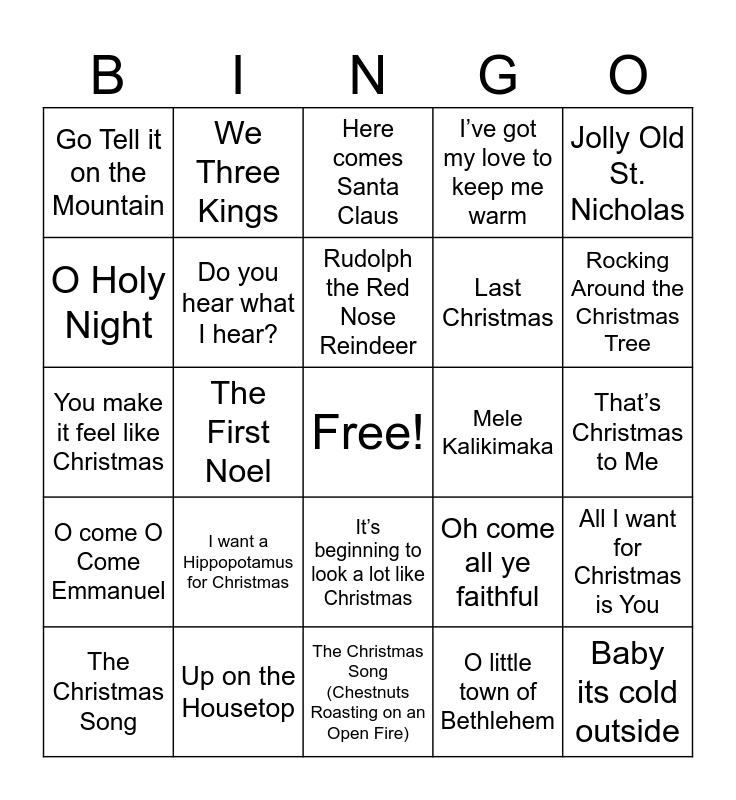 This bingo card has a free space and 24 words: I want a Hippopotamus for Christmas, Up on the Housetop, Rudolph the Red Nose Reindeer, The Christmas Song, Jolly Old St. Nicholas, Go Tell it on the Mountain, O Holy Night, We Three Kings, Mele Kalikimaka, It’s beginning to look a lot like Christmas, Last Christmas, You make it feel like Christmas, Oh come all ye faithful, All I want for Christmas is You, Do you hear what I hear?, O little town of Bethlehem, That’s Christmas to Me, Here comes Santa Claus, Rocking Around the Christmas Tree, The First Noel, Baby its cold outside, O come O Come Emmanuel, I’ve got my love to keep me warm and The Christmas Song (Chestnuts Roasting on an Open Fire).