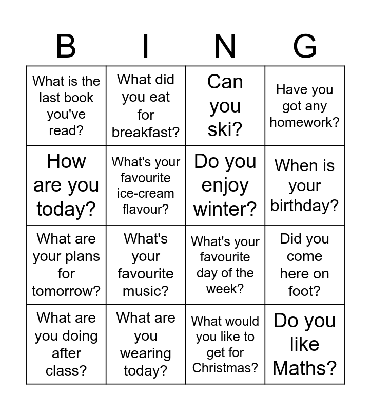 This bingo card has 16 words: What are you wearing today?, Did you come here on foot?, Can you ski?, What is the last book you've read?, What are your plans for tomorrow?, What did you eat for breakfast?, What's your favourite day of the week?, What would you like to get for Christmas?, How are you today?, What's your favourite ice-cream flavour?, What are you doing after class?, Have you got any homework?, What's your favourite music?, When is your birthday?, Do you enjoy winter? and Do you like Maths?.