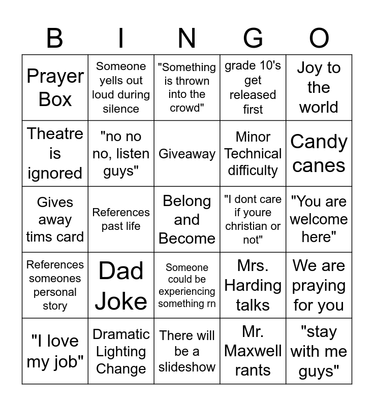 This bingo card has a free space and 24 words: Dad Joke, Dramatic Lighting Change, Giveaway, "I love my job", Joy to the world, Prayer Box, Theatre is ignored, Someone yells out loud during silence, "I dont care if youre christian or not", Someone could be experiencing something rn, Minor Technical difficulty, Gives away tims card, Mrs. Harding talks, We are praying for you, "no no no, listen guys", Mr. Maxwell rants, "You are welcome here", "Something is thrown into the crowd", Candy canes, References past life, "stay with me guys", References someones personal story, grade 10's get released first and There will be a slideshow.