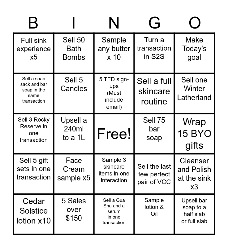This bingo card has a free space and 24 words: Face Cream sample x5, 5 Sales over $150, 5 TFD sign-ups (Must include email), Cedar Solstice lotion x10, Make Today's goal, Full sink experience x5, Sell a soap sack and bar soap in the same transaction, Sell 50 Bath Bombs, Sell 75 bar soap, Sample 3 skincare items in one interaction, Sell a full skincare routine, Sell 3 Rocky Reserve in one transaction, Sell the last few perfect pair of VCC, Cleanser and Polish at the sink x3, Sell 5 Candles, Sample lotion & Oil, Wrap 15 BYO gifts, Sample any butter x 10, Sell one Winter Latherland, Upsell a 240ml to a 1L, Upsell bar soap to a half slab or full slab, Sell 5 gift sets in one transaction, Turn a transaction in S2S and Sell a Gua Sha and a serum in one transaction.