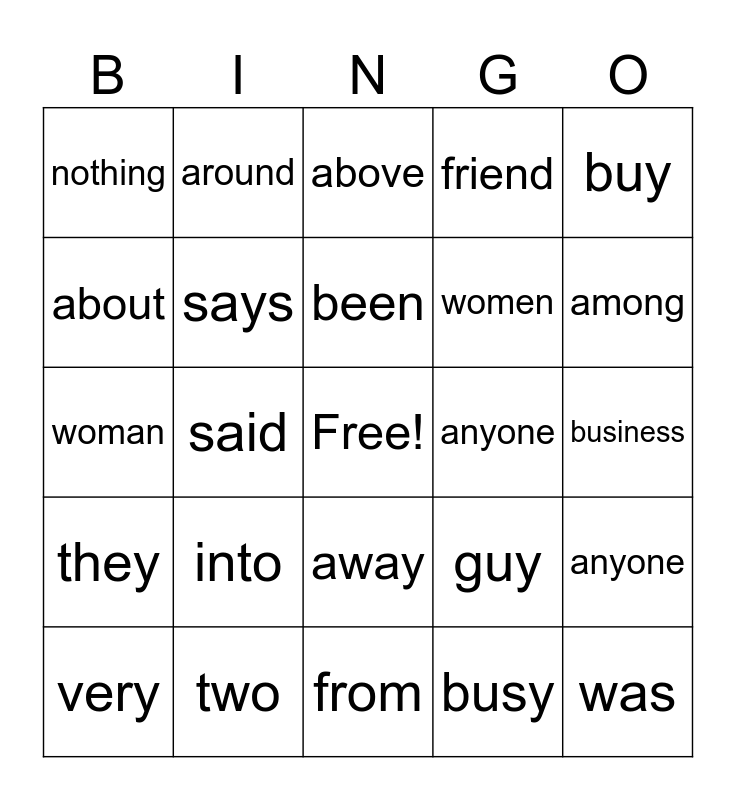 This bingo card has a free space and 24 words: into, two, been, very, buy, nothing, about, around, anyone, away, women, woman, guy, anyone, says, busy, business, above, among, said, was, they, friend and from.