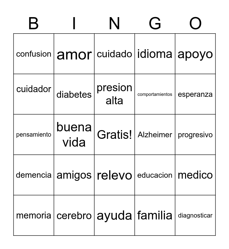 This bingo card has a free space and 28 words: medico, personalidad, comportamientos, familia, cuidador, cuidado, amor, demencia, Alzheimer, memoria, pensamiento, idioma, cerebro, ayuda, esperanza, envejecimiento, amigos, diabetes, presion alta, relevo, confusion, comunicar, diagnosticar, buena vida, progresivo, educacion, apoyo and positividad.