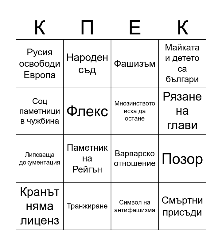 This bingo card has 16 words: Транжиране, Позор, Фашизъм, Русия освободи Европа, Липсваща документация, Народен съд, Варварско отношение, Символ на антифашизма, Соц паметници в чужбина, Флекс, Кранът няма лиценз, Майката и детето са българи, Паметник на Рейгън, Рязане на глави, Мнозинството иска да остане and Смъртни присъди.