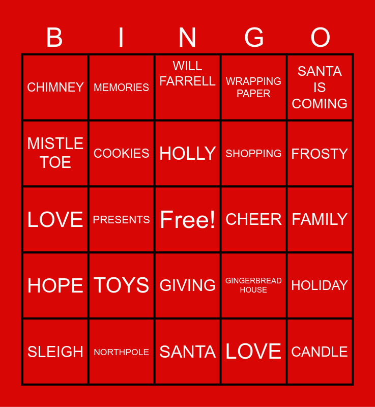 This bingo card has a free space and 30 words: STOCKING, NORTHPOLE, WILL FARRELL, IM SINGING, SANTA IS COMING, CHIMNEY, COOKIES, HOLLY, SHOPPING, CANDLE, SLEIGH, TOYS, LOVE, STAR, HOPE, EGG NOG, SANTA, CHEER, HOLIDAY, MISTLE TOE, PRESENTS, KRISTIE LOVES XMAS, WRAPPING PAPER, FAMILY, LOVE, MEMORIES, GIVING, GINGERBREAD HOUSE, FROSTY and RUDOLPH.