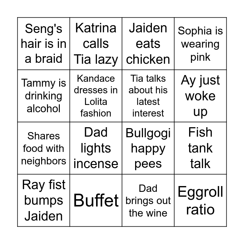 This bingo card has 16 words: Buffet, Fish tank talk, Jaiden eats chicken, Seng's hair is in a braid, Shares food with neighbors, Katrina calls Tia lazy, Bullgogi happy pees, Dad brings out the wine, Tammy is drinking alcohol, Kandace dresses in Lolita fashion, Ray fist bumps Jaiden, Sophia is wearing pink, Dad lights incense, Ay just woke up, Tia talks about his latest interest and Eggroll ratio.