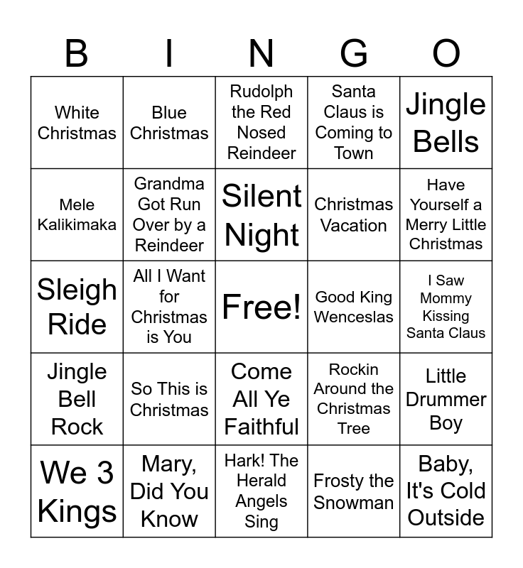 This bingo card has a free space and 32 words: Frosty the Snowman, I'll Be Home for Christmas, All I Want for Christmas is You, 12 Days of Christmas, Jingle Bell Rock, Grandma Got Run Over by a Reindeer, Jingle Bells, Little Drummer Boy, Blue Christmas, Santa Baby, Silent Night, Rudolph the Red Nosed Reindeer, Deck the Halls, It's Beginning to Look a Lot Like Christmas, Good King Wenceslas, Let It Snow, We 3 Kings, Sleigh Ride, Come All Ye Faithful, So This is Christmas, Rockin Around the Christmas Tree, Run, Run Rudolph, I Saw Mommy Kissing Santa Claus, Mary, Did You Know, Baby, It's Cold Outside, Santa Claus is Coming to Town, Christmas Vacation, Mele Kalikimaka, White Christmas, Hark! The Herald Angels Sing, Last Christmas and Have Yourself a Merry Little Christmas.