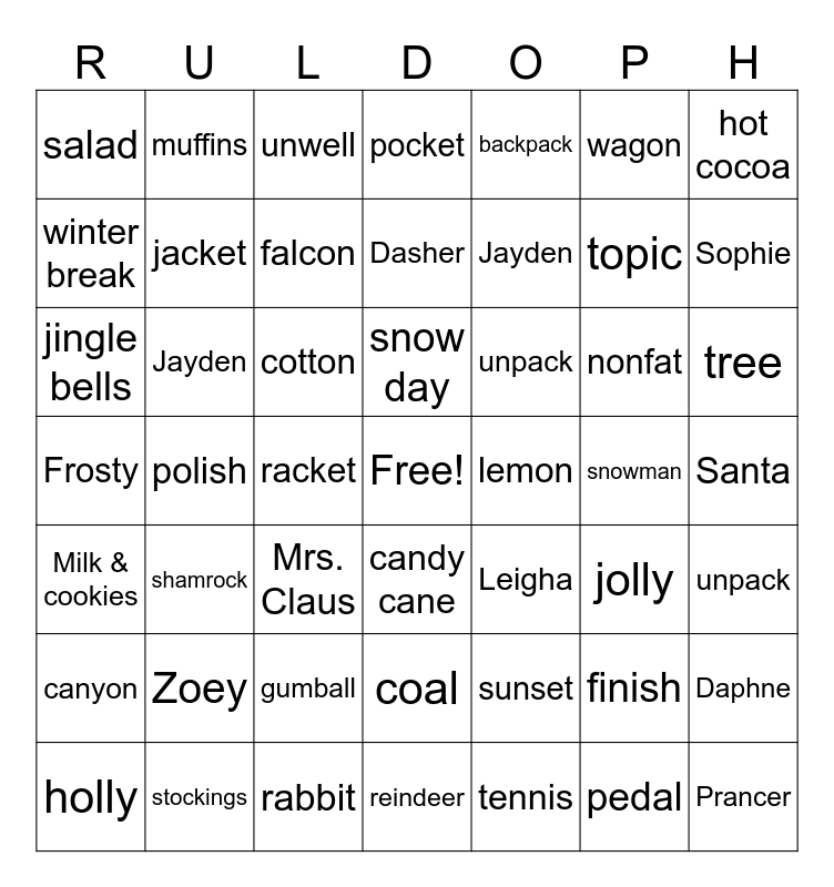 This bingo card has a free space and 48 words: sunset, topic, reindeer, polish, cotton, Santa, muffins, stockings, wagon, candy cane, hot cocoa, pocket, nonfat, unpack, canyon, snowman, winter break, Sophie, finish, backpack, Jayden, racket, salad, jacket, Daphne, falcon, tree, holly, snow day, Jayden, pedal, lemon, unpack, Zoey, Frosty, Leigha, jolly, jingle bells, Mrs. Claus, gumball, Milk & cookies, Prancer, unwell, rabbit, Dasher, coal, shamrock and tennis.