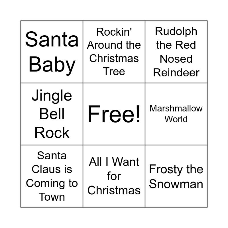 This bingo card has a free space and 21 words: Winter Wonderland, Blue Christmas, Rockin' Around the Christmas Tree, The Christmas Song (chestnuts roasting on an open fire...), Let it Snow, Santa Claus is Coming to Town, Santa Baby, Rudolph the Red Nosed Reindeer, Sleigh Ride, All I Want for Christmas, White Christmas, Jingle Bell Rock, No Place Like Home for the Holidays, Twelve Days of Christmas, Marshmallow World, Last Christmas, Feliz Navidad, Have Yourself a Merry Little Christmas, Frosty the Snowman, Mele Kalikimaka and I Saw Mommy Kissing Santa Claus.