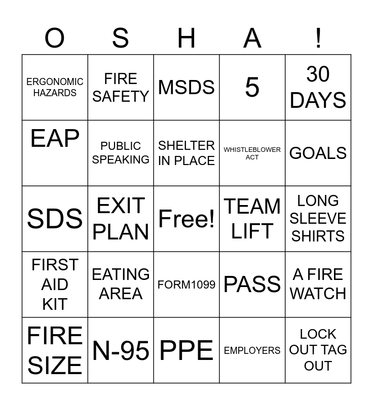 This bingo card has a free space and 30 words: N-95, 7 HOURS, EXIT PLAN, SAFETY LEADER, ERGONOMIC HAZARDS, MSDS, PUBLIC SPEAKING, FORM1099, TEAM LIFT, PPE, LONG SLEEVE SHIRTS, LOCK OUT TAG OUT, EMPLOYERS, BLOODBORNE PATHOGENS, GOALS, PROTECTIVE GLASSES, PASS, FIRST AID KIT, EATING AREA, 30 DAYS, SDS, OSHA, FIRE SAFETY, WHISTLEBLOWER ACT, EAP, 5, A FIRE WATCH, FIRE SIZE, SHELTER IN PLACE and FIRE.