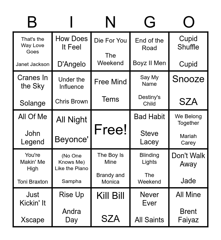 This bingo card has a free space and 24 words: Just Kickin' It Xscape, (No One Knows Me) Like the Piano Sampha, Free Mind Tems, Never Ever All Saints, Cupid Shuffle Cupid, That's the Way Love Goes Janet Jackson, How Does It Feel D'Angelo, Die For You The Weekend, Bad Habit Steve Lacey, We Belong Together Mariah Carey, All Of Me John Legend, Under the Influence Chris Brown, Blinding Lights The Weekend, Don't Walk Away Jade, Cranes In the Sky Solange, Rise Up Andra Day, Kill Bill SZA, End of the Road Boyz II Men, Snooze SZA, You're Makin' Me High Toni Braxton, All Night Beyonce', The Boy Is Mine Brandy and Monica, Say My Name Destiny's Child and All Mine Brent Faiyaz.
