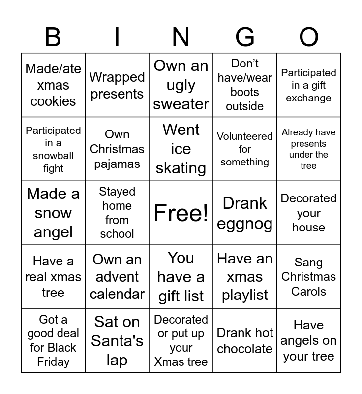This bingo card has a free space and 31 words: Decorated or put up your Xmas tree, Played in the snow, Stayed home from school, Watched xmas movies, Made/ate xmas cookies, Own an ugly sweater, Own Christmas pajamas, Have an xmas playlist, Drank eggnog, Drank hot chocolate, Decorated your house, Have angels on your tree, Have decorations outside of your house, Built a snowman, Already have presents under the tree, Hosted a Family meal, Sang Christmas Carols, Own an advent calendar, Have a real xmas tree, You have a gift list, Participated in a gift exchange, Built a gingerbread house, Got a good deal for Black Friday, Wrapped presents, Volunteered for something, Participated in a snowball fight, Don’t have/wear boots outside, Made a snow angel, Sat on Santa's lap, Went ice skating and Played a winter sport or activity.