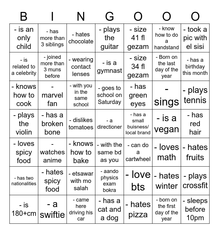 This bingo card has 50 words: - plays crossfit, - Born on the last day of the year, - born on the first day of the year, - has a broken bone, - with you in the same school, - with the same bd as you, - has more than 3 siblings, - has a cat and a dog, - know how to do a handstand, - can do a cartwheel, - took a pic with el sisi, - plays the guitar, - sings, - has green eyes, - etsawar with mo salah, - has red hair, - is related to a celebrity, - has a birthday this month, - is 180+cm, - size 41 fl gezam, - size 34 fl gezam, - dislikes tomatoes, - is an only child, - joined more than 3 muns before, - a swiftie, - a directioner, - wearing contact lenses, - came here driving his car, - hates chocolate, - goes to school on Saturday, - lives in zayed, - loves spicy food, - hates spicy food, - aando physics exam bokra, - plays the violin, - is a vegan, - loves math, - hates fruits, - has two nationalities, - knows how to cook, - knows how to bake, - love bts, - watches anime, - hates pizza, - plays tennis, - is a gymnast, - has a small buisness/ local brand, - hates winter, - marvel fan and - sleeps before 10pm.