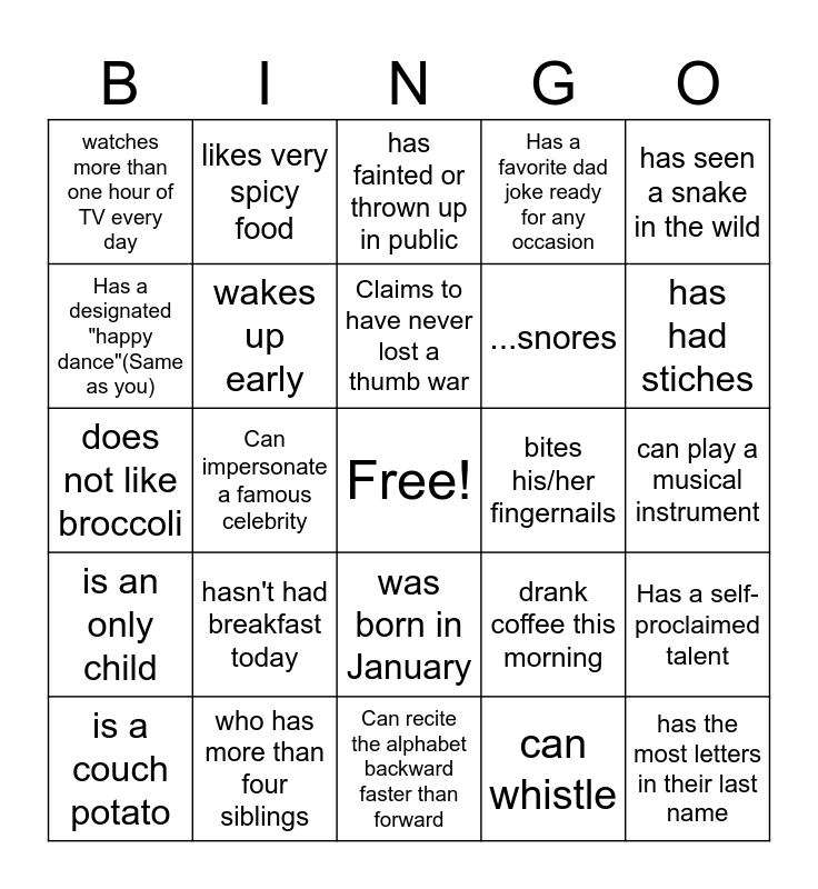 This bingo card has a free space and 25 words: hasn't had breakfast today, Can recite the alphabet backward faster than forward, Claims to have never lost a thumb war, is a couch potato, has seen a snake in the wild, watches more than one hour of TV every day, Has a designated "happy dance"(Same as you), likes very spicy food, bites his/her fingernails, was born in January, ...snores, does not like broccoli, drank coffee this morning, Has a self-proclaimed talent, wakes up early, wears socks to bed, can play a musical instrument, has fainted or thrown up in public, has had stiches, Can impersonate a famous celebrity, has the most letters in their last name, who has more than four siblings, is an only child, Has a favorite dad joke ready for any occasion and can whistle.