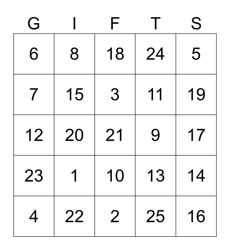 This bingo card has 25 words: 1, 2, 3, 4, 5, 6, 7, 8, 9, 10, 11, 12, 13, 14, 15, 16, 17, 18, 19, 20, 21, 22, 23, 24 and 25.