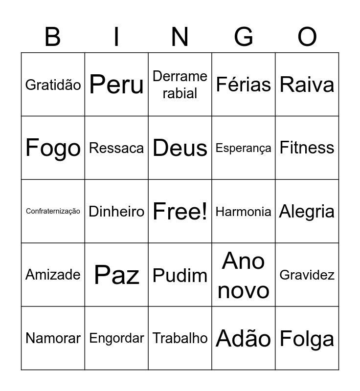 This bingo card has a free space and 38 words: Casa, Amor, Sexo, Ressaca, Gravidez, Paz, Deus, Paciência, Raiva, Esperança, Dinheiro, Férias, Folga, Alegria, Fogo, Amizade, Viagem, Derrame rabial, Fama, Harmonia, Gratidão, Engordar, Fitness, Namorar, Bagunçar, Trabalho, Fé, Carro, Pix, Festa, Cachaça, Pudim, Adão, Peru, Plantão, Ano novo, Confraternização and Banho.