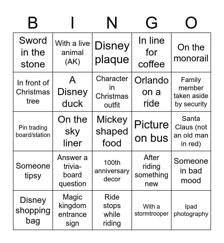 This bingo card has 49 words: Hidden Mickey, Mickey shaped food, Over 60 minute wait time, Ride stops while riding, Answer a trivia-board question, At purple wall (MK), With a live animal (AK), With a Castmember, In front of Christmas tree, Gingerbread house at resort, A Disney duck, In line for coffee, Someone in bad mood, After riding something new, Wearing 3D glasses, With a Disney snack, Character in Christmas outfit, Picture on bus, Tired family member, On the monorail, On the sky liner, With a stormtrooper, Sword in the stone, Orlando on a ride, Family member singing along (pic or vid), Family member taken aside by security, Disney shopping bag, Fireworks, 100th anniversary decor, Someone tipsy, Parade Toy Soldiers, Disney world entrance sign, Hollywood entrance sign, Epcot entrance sign, Magic kingdom entrance sign, Animal kingdom entrance sign, Picture taken during ride, Lego sea monster, Santa Claus (not an old man in red), Mickey in Christmas outfit, Doing something new, Gold character statue, Ipad photography, Playing heads up in line, Pin trading board/station, Disney plaque, Droid sighting, At Fantasmic and At group meal.