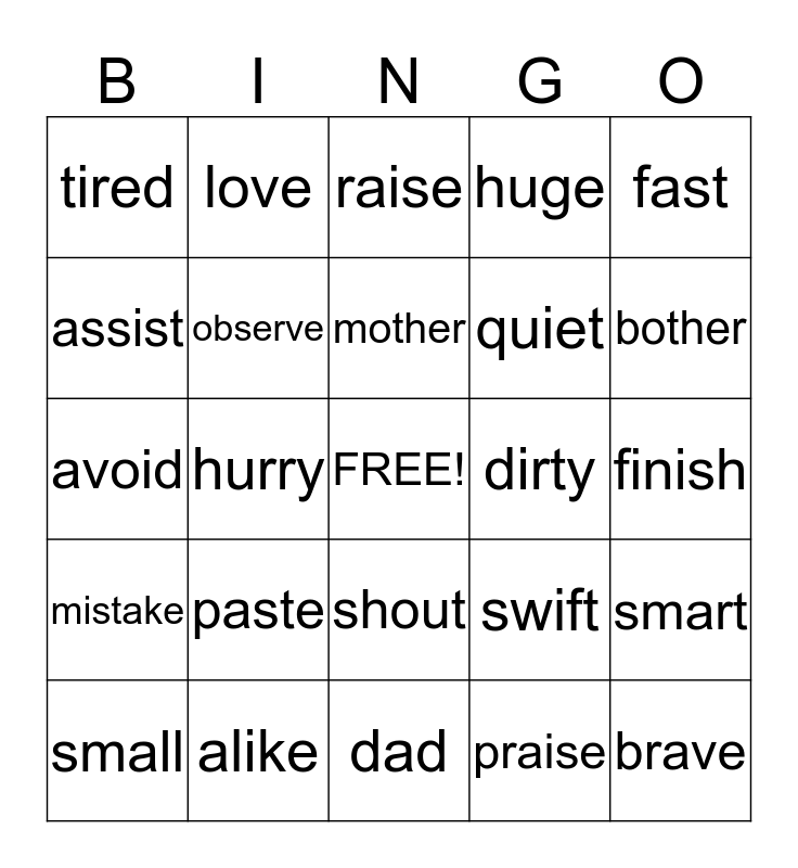 This bingo card has a free space and 24 words: paste, alike, mother, small, fast, tired, assist, love, dirty, shout, quiet, avoid, swift, smart, observe, praise, finish, raise, bother, hurry, brave, mistake, huge and dad.