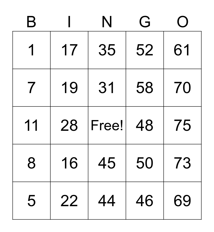 This bingo card has a free space and 24 words: 5, 16, 31, 46, 61, 1, 17, 35, 48, 75, 11, 19, 50, 73, 7, 22, 44, 52, 70, 8, 28, 45, 58 and 69.