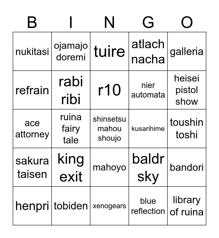 This bingo card has a free space and 24 words: king exit, tobiden, r10, henpri, galleria, nukitasi, refrain, ojamajo doremi, kusarihime, mahoyo, nier automata, ace attorney, baldr sky, bandori, rabi ribi, blue reflection, toushin toshi, tuire, heisei pistol show, ruina fairy tale, library of ruina, sakura taisen, atlach nacha and xenogears.