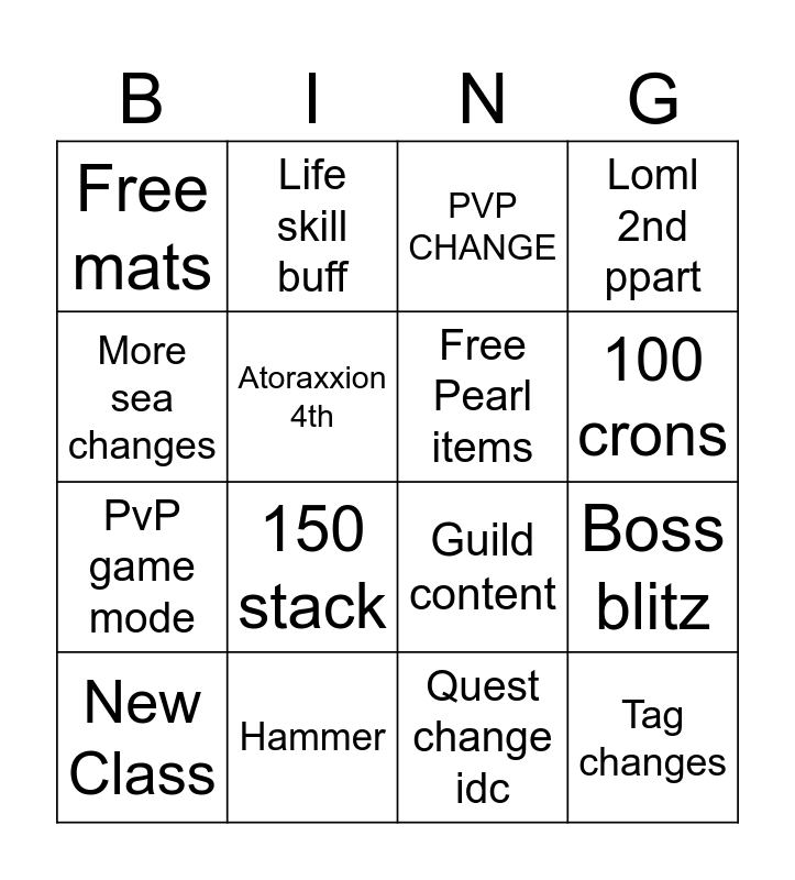 This bingo card has 16 words: New Class, Hammer, PVP CHANGE, Loml 2nd ppart, More sea changes, Life skill buff, Guild content, Boss blitz, Free mats, Atoraxxion 4th, Quest change idc, 100 crons, PvP game mode, 150 stack, Free Pearl items and Tag changes.