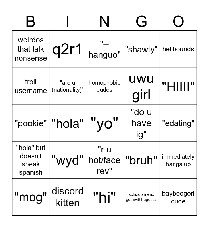 This bingo card has a free space and 24 words: "wyd", discord kitten, homophobic dudes, "mog", hellbounds, weirdos that talk nonsense, troll username, q2r1, "do u have ig", "r u hot/face rev", uwu girl, "pookie", "bruh", immediately hangs up, "are u (nationality)", schizophrenic gothwithhugetits., "edating", "--hanguo", "HIIII", "hola", baybeegorl dude, "hola" but doesn't speak spanish, "shawty" and "hi".