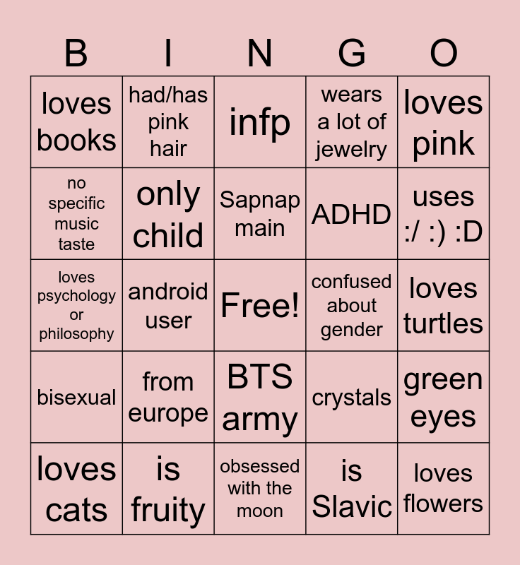 This bingo card has a free space and 24 words: from europe, is fruity, Sapnap main, loves cats, loves pink, loves books, no specific music taste, had/has pink hair, confused about gender, BTS army, ADHD, loves psychology or philosophy, crystals, green eyes, only child, is Slavic, loves turtles, infp, uses :/ :) :D, android user, loves flowers, bisexual, wears a lot of jewelry and obsessed with the moon.