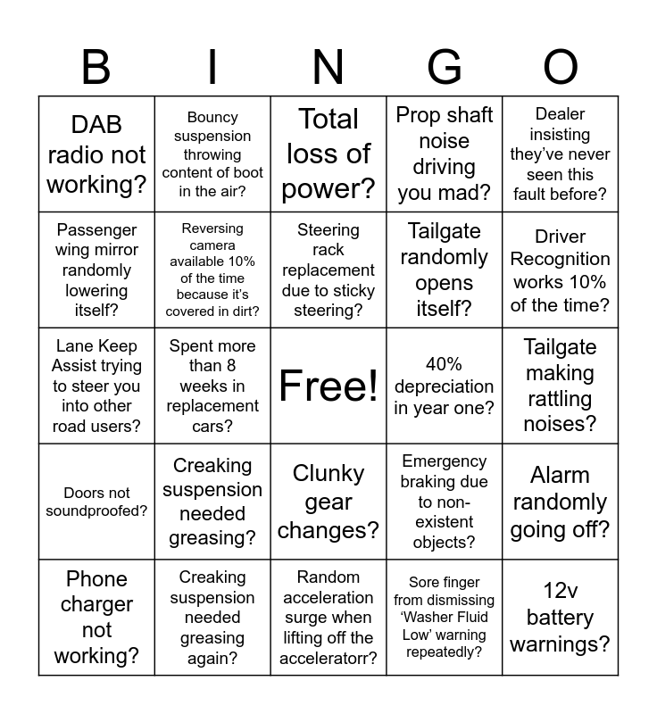 This bingo card has a free space and 24 words: Creaking suspension needed greasing?, Creaking suspension needed greasing again?, Steering rack replacement due to sticky steering?, Phone charger not working?, Dealer insisting they’ve never seen this fault before?, DAB radio not working?, Passenger wing mirror randomly lowering itself?, Bouncy suspension throwing content of boot in the air?, 40% depreciation in year one?, Clunky gear changes?, Tailgate randomly opens itself?, Lane Keep Assist trying to steer you into other road users?, Emergency braking due to non-existent objects?, Alarm randomly going off?, Reversing camera available 10% of the time because it’s covered in dirt?, Sore finger from dismissing ‘Washer Fluid Low’ warning repeatedly?, Tailgate making rattling noises?, Total loss of power?, Driver Recognition works 10% of the time?, Spent more than 8 weeks in replacement cars?, 12v battery warnings?, Doors not soundproofed?, Prop shaft noise driving you mad? and Random acceleration surge when lifting off the acceleratorr?.