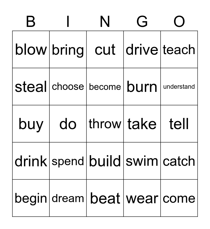 This bingo card has 25 words: spend, beat, become, begin, teach, blow, steal, bring, take, build, burn, buy, swim, catch, choose, come, tell, cut, understand, do, throw, dream, drink, drive and wear.