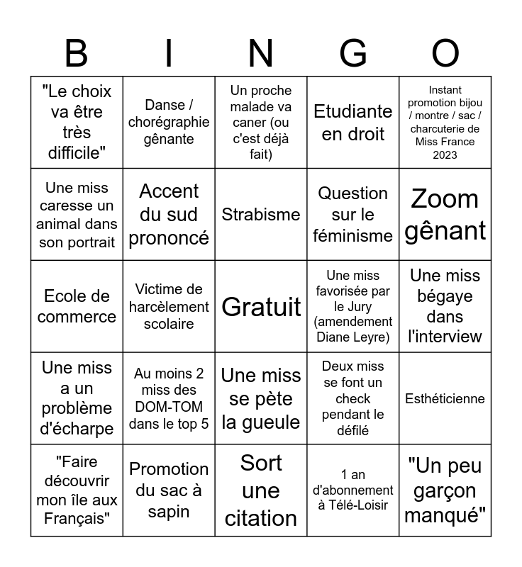 This bingo card has a free space and 24 words: Au moins 2 miss des DOM-TOM dans le top 5, Promotion du sac à sapin, Strabisme, "Faire découvrir mon île aux Français", Instant promotion bijou / montre / sac / charcuterie de Miss France 2023, "Le choix va être très difficile", Une miss caresse un animal dans son portrait, Danse / chorégraphie gênante, Une miss favorisée par le Jury (amendement Diane Leyre), Une miss se pète la gueule, Question sur le féminisme, Ecole de commerce, Deux miss se font un check pendant le défilé, Esthéticienne, Accent du sud prononcé, 1 an d'abonnement à Télé-Loisir, Une miss bégaye dans l'interview, Un proche malade va caner (ou c'est déjà fait), Zoom gênant, Victime de harcèlement scolaire, "Un peu garçon manqué", Une miss a un problème d'écharpe, Etudiante en droit and Sort une citation.