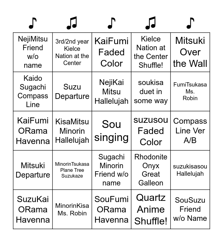 This bingo card has a free space and 24 words: MinorinTsukasa Plane Tree Suzukaze, MinorinKisa Ms. Robin, NejiKai Mitsu Hallelujah, SuzuKai ORama Havenna, Mitsuki Over the Wall, NejiMitsu Friend w/o name, Kaido Sugachi Compass Line, 3rd/2nd year Kielce Nation at the Center, suzusou Faded Color, Sugachi Minorin Friend w/o name, soukisa duet in some way, KaiFumi ORama Havenna, Rhodonite Onyx Great Galleon, suzukisasou Hallelujah, Suzu Departure, Quartz Anime Shuffle!, Compass Line Ver A/B, KaiFumi Faded Color, FumiTsukasa Ms. Robin, KisaMitsu Minorin Hallelujah, SouSuzu Friend w/o Name, Mitsuki Departure, Kielce Nation at the Center Shuffle! and SouFumi ORama Havenna.